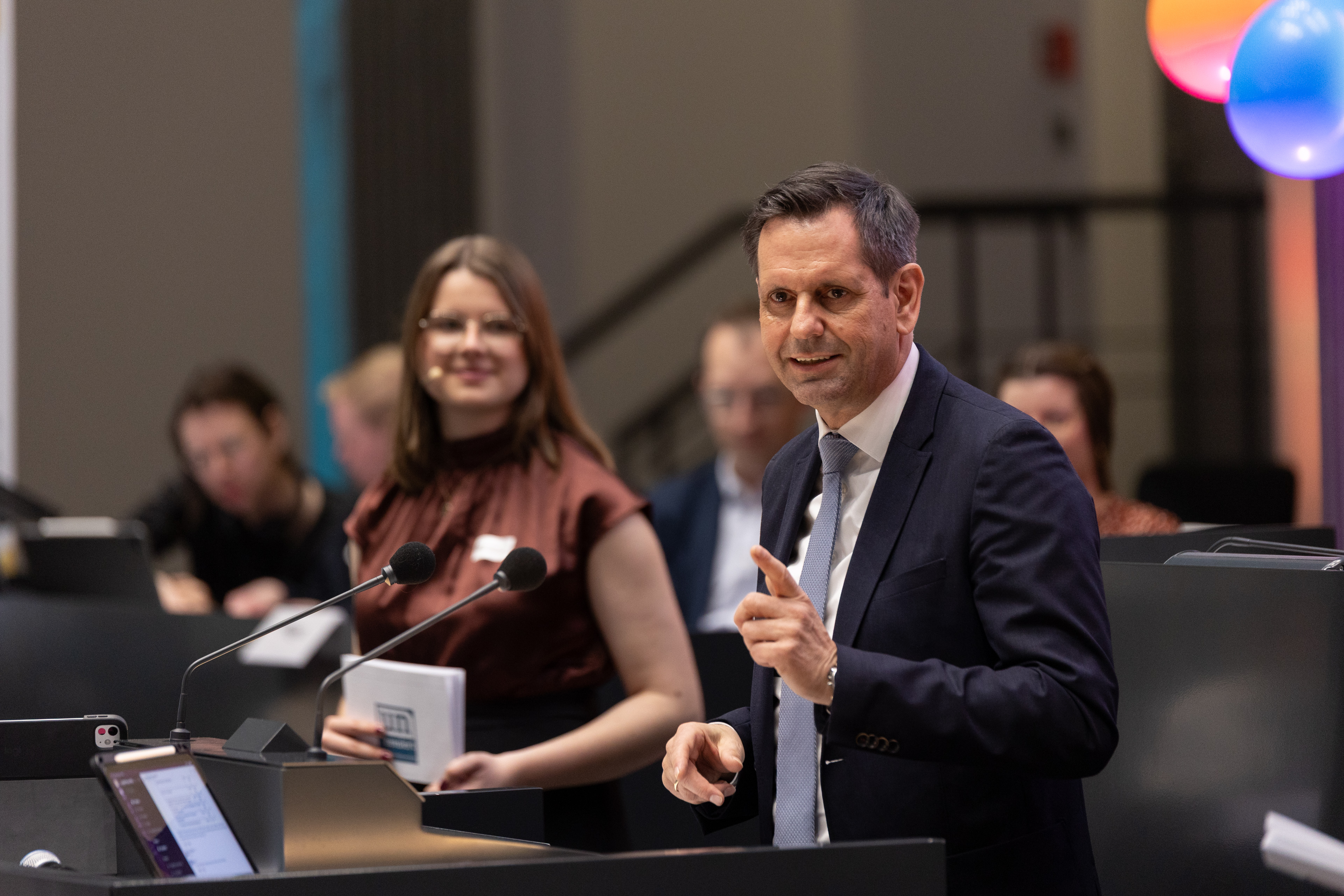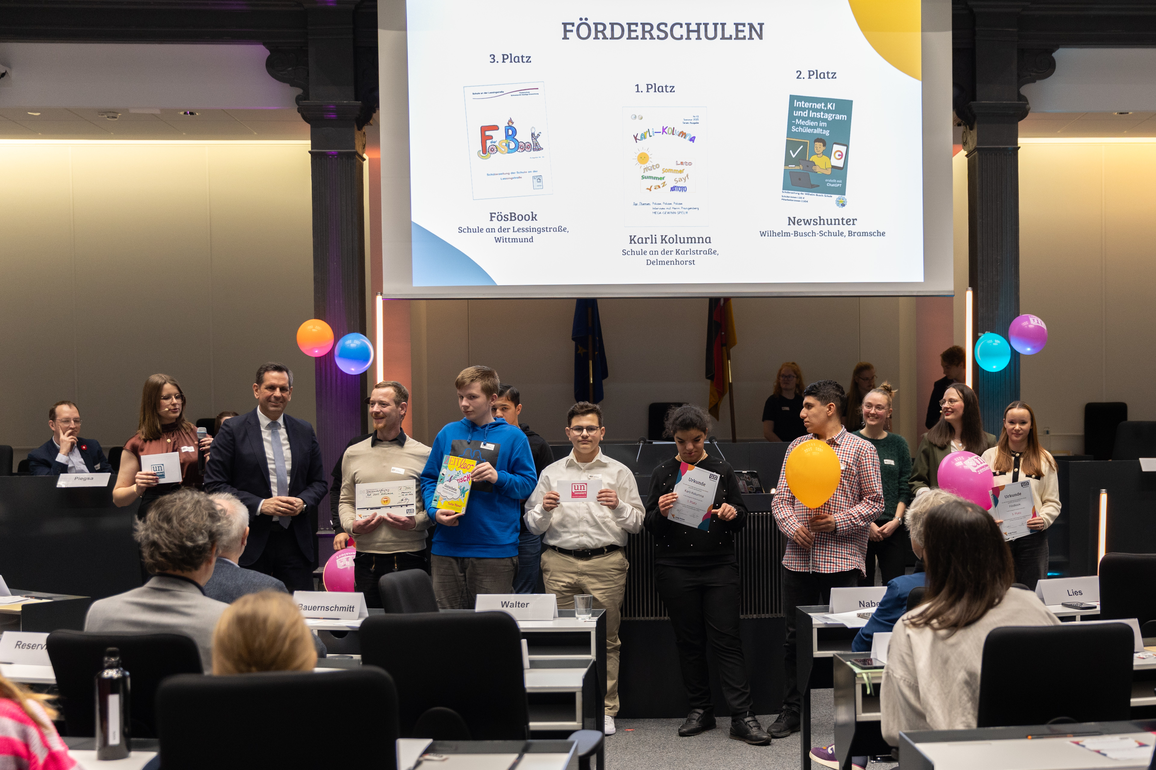 Die Präsidentin des Niedersächsischen Landtags, Hanna Naber (SPD), begrüßte die Nachwuchsjournalist*innen: „Ihr alle habt eure eigenen Erfahrungen mitgebracht, eure eigenen Themen, euren eigenen Blick auf die Welt. Ihr habt euch Gedanken gemacht, Fragen gestellt und Dinge sichtbar gemacht. Genau das verbindet euch. Und genau das macht diesen Wettbewerb so besonders.“ Außerdem verdeutlichte Naber, wie bedeutend die Arbeit der jungen Medienmachenden für die Gesellschaft ist: „Demokratie lebt davon, dass Menschen Fragen stellen, dass sie genau hinschauen, dass sie sich einmischen, dass sie auch mal unbequem sind. Das ist gerade heute wichtiger denn je. Denn wir erleben alle, wie schnell sich etwas verbreitet, wie schnell Aufregung entsteht, und wie Vieles einfach gelikt, geteilt und weitergeleitet wird – ohne, dass noch mal jemand genauer hinschaut. Genau deshalb macht es einen Unterschied, ob jemand einfach etwas behauptet oder ob jemand – so wie ihr – sauber arbeitet, nachfragt, prüft, und Verantwortung für das übernimmt, was am Ende veröffentlicht wird. Je länger ich mich hier in dieser Runde umschaue, desto klarer wird mir: Die eigentlichen Gewinner dieses Tages seid nicht nur ihr, sondern sind am Ende wir alle und unsere Demokratie. Denn sie lebt davon, dass junge Menschen wie ihr sich einmischen, genau hinschauen, nachfragen und ihre Stimme erheben. Genau das tut ihr. Und das ist nicht nur gut für eure Schulen und eure Redaktionen, das tut uns allen gut.“ Naber erinnerte sich auch an ihre eigene Zeit als Redakteurin einer Schüler*innenzeitung vor etwa 40 Jahren.